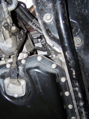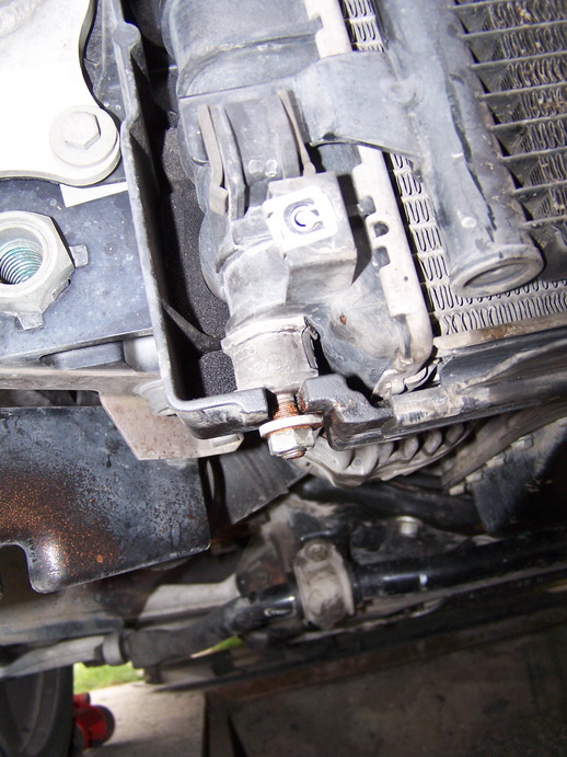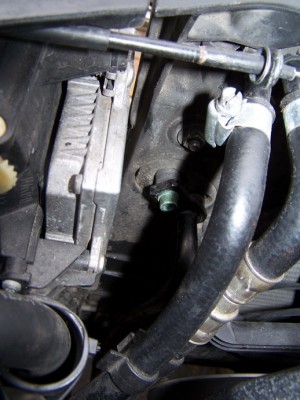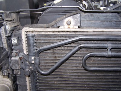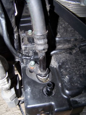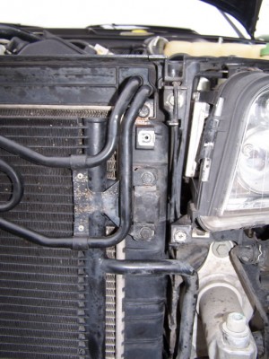 5. Открутить болты крепления шлангов АКПП идущих к радиатору, отсоединить их и отвести в сторону. При отсоединении с радиатора из шлангов вытечет немного масла АКПП (около 300 грамм), поэтому подставить какую-то тару для улавливания этого масла.