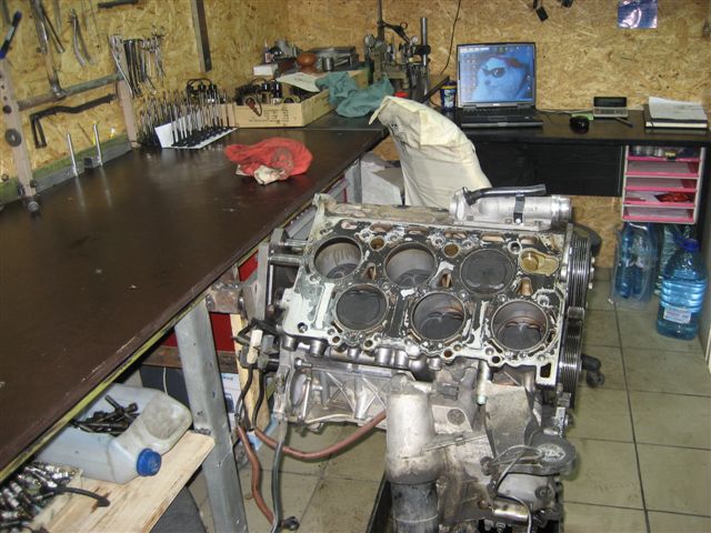 Несколько слов о снятии и разборке мотора, Особых затруднений при хорошем инструменте небыло. Капот не снимал он мне как то не мешал, свет в гараже хороший что сверху что с низу. Взял у товарища подкатной кран, и дело пошло, фото было выше. вынул мотор с коробкой и рассоеденял на полу. А потом пошло снятие навесного, особых заморочек тоже нет, проводку снял вместе с блоками управления, и на снятом моторе всё спокойно отключил. Газораспределение и головки снял тоже на полу, а потом повесил блок на поворотку, разобрал низ блока и вынул поршня. вот несколько фоток.