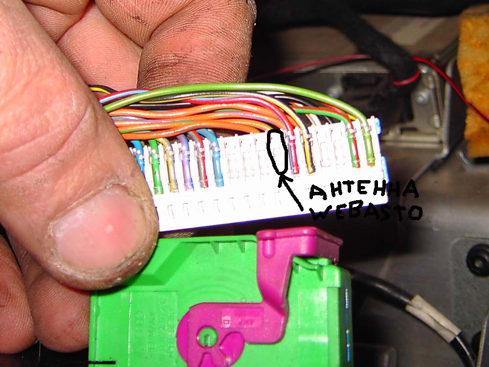 ? пин (пин не помню) на фишке webasto (зеленый с красной полосой) это диагностический провод я подключил его к первому попавшемуся проводу такой же расцветки на фишке в коробке где стоят мозги двигателя и коробки. Соответственно без этого провода VAG-com не будет видеть webasto.