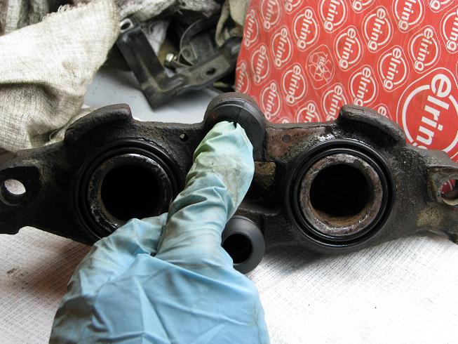 Стоп, одна латунная втулка присутствует, совершенно без следов износа, а где вторая? Здесь кто-то был! Пыльники поршней целы, хотя вид у них потрепанный. Рвем пыльник поршня и ... откуда это?