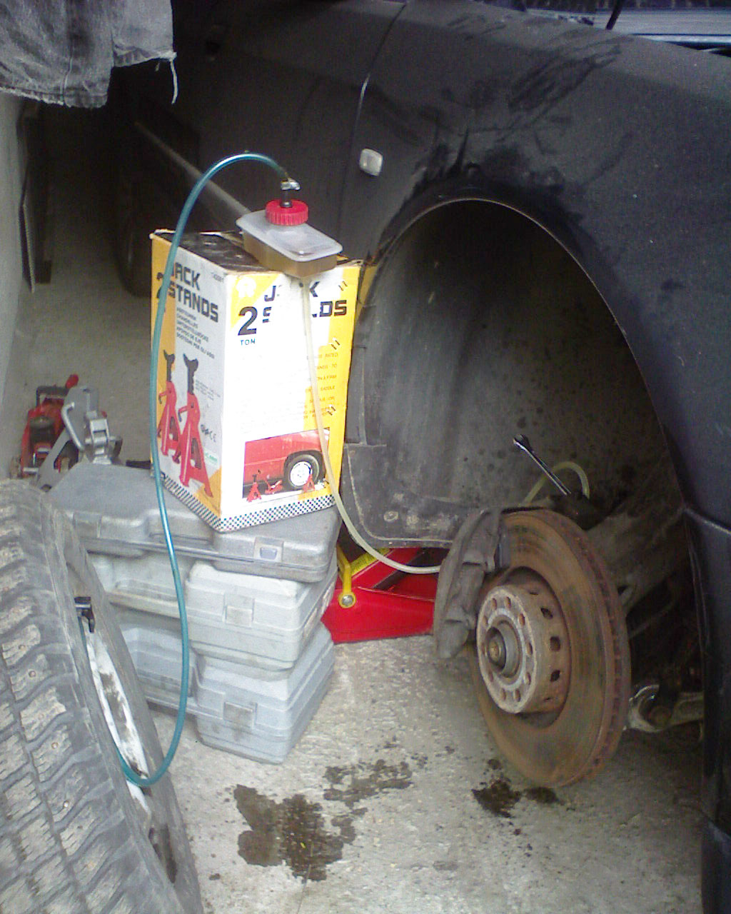 Не смог прокачать систему обычным способом (был один и помочь никто не мог), с аэратором, на заведённом двигателе и в других режимах тоже. Обратился к нашему форуму и вычитал тему Славы Akin, где он советовал прокачку делать в обратном направлении - от суппорта в бачок. Поэтому был изобретён сей девайс
