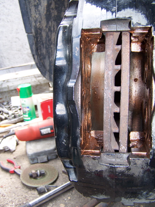 6. Вдавить все поршни тормозного суппорта, предварительно брызнув ВД40 под пыльники поршней тормозного суппорта, а также предварительно продуть тщательно сжатым воздухом тормозной суппорт в районе поршней суппорта