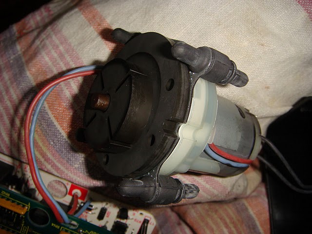Необходимо заменить блок насоса в сборе с электромотором. На мой взгляд, эту процедуру проще выполнять со снятым «сэндвичем». Для снятия электромотора нужно отсоединив воздушную трубку, аккуратно протолкнуть 4 резиновых крепления насоса внутрь. Затем, отсоединив питание вынуть сам мотор.