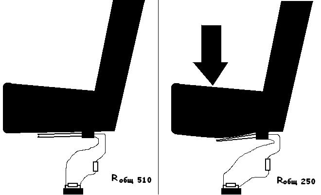 Так вот, ближе к телу. Мысль заключается в следующем: мы подключаем к фишке(той которая со стороны машины) сопротивление на 510 ом. Всё проходит успешно, машина думает что датчик функционирует и просто на сидении никого нет. Теперь самая главная часть фокуса, нам надо организовать "лягушку" т.е. кнопку или пару контактов, которые будут замыкаться тогда когда на сидении кто-то есть. Самое простое что пришло мне в голову это решение на основании датчика для попогрева. Надо все лишь под ту пласнину подложить кнопочку, которая будет замыкаться и самое главное как-нибудь её так закрупить, м.б. на пружине чтобы независимо от нагрузки кнопка нажималась но не ломалась под весом а всего лишь уходила ниже. Либо вытащить контактную группу из какого-либо совкового реле(длинные такие параллельно идущие пластинки с круглыми контактами на концах. И разместить это так чтобы пластина нажимала на них. Короче механическая часть - это на усмотрение каждого. В итоге мы должны получить простое замыкание при посадке пассажира и размыкание при его выходе.