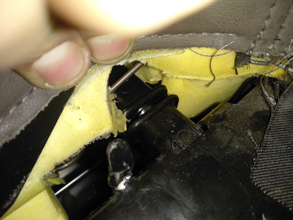 Дальше сложнее. Посередине этой подушки есть две петельки к каркасу сиденья, отстегиваем(нет фото) Наверху подушка цепляется за крючки, Если раздвинуть стык,там все видно. Я затупил и разогнул их но если разобраться, то там намного проще. В общем подушка снята. Идем далее...