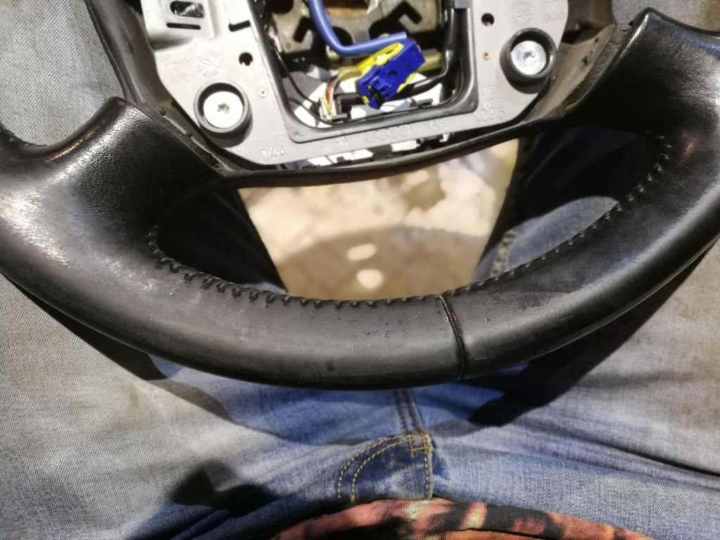 Начинаем зачищать руль.Нужно сбить глянец и старую краску,где она будет сварачиваться.На местах частого трения,краска сотрётся быстро и будет проглядывается кожа-тут больше не трем!