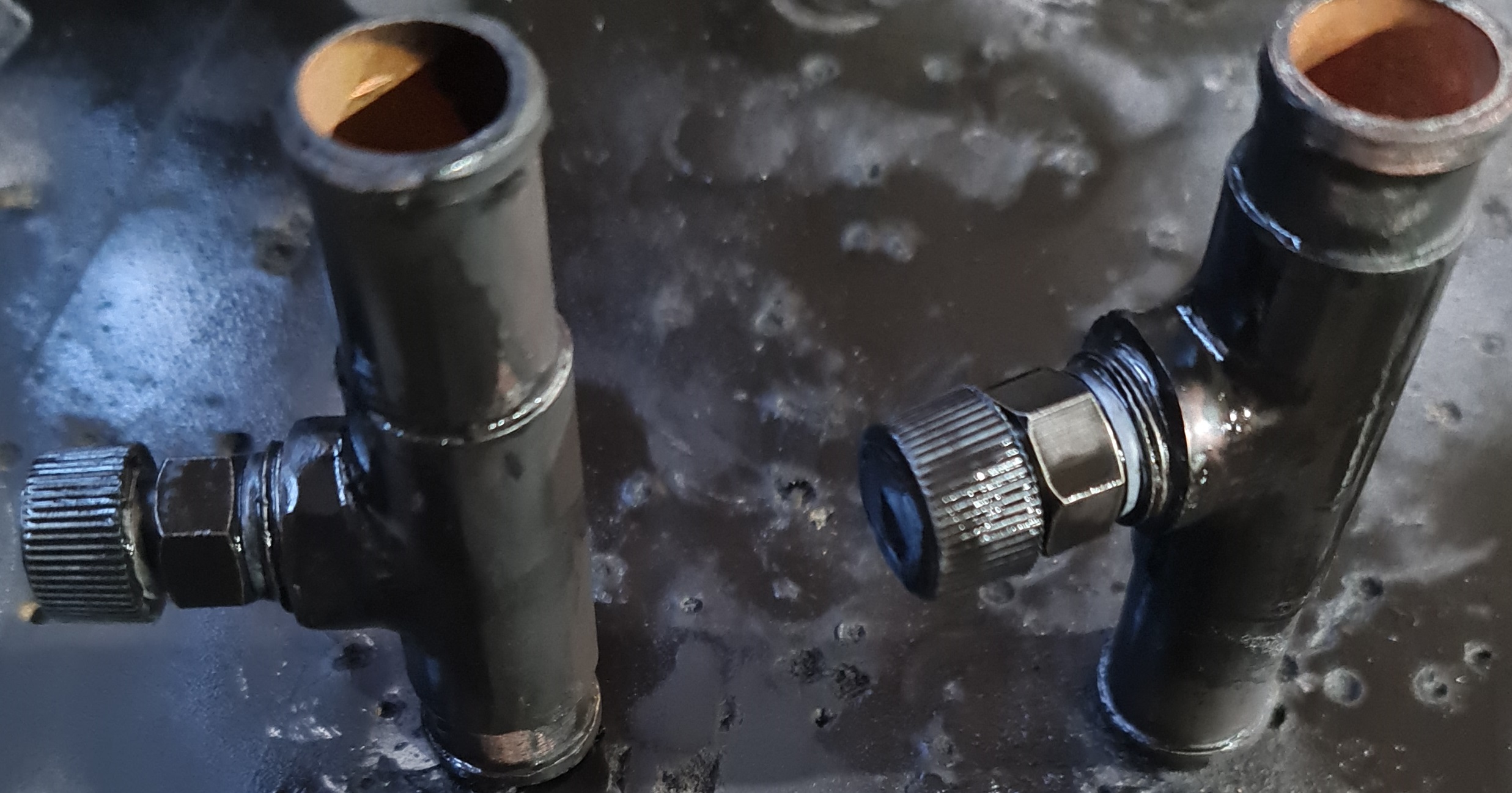 Добрый день самоделкины, потрескались и у меня эти тройники, но так как легких путей не ищем, а меди у меня после ремонта немного осталось то и решил проблему. Поручики, тряпками прошу сильно не бить, час работы и пол дня беготни по городу, ну нет таких кранов маевского в обычных магазинах. Поиск на фарпосте рулит. Медь 18мм, две вставки 40 мм и 26 соответственно, тройник обрезал, футорку наполовину обрезал, а грани обточил, зачистил все намазал флюсом и опаял оловом. Ершик на концах отпилил как раз от тройников и с прямой муфты на трубу. Минимально шлифанул. Покрасил. Затраты минимальны примерно 200р. штука. Всем спасибо.