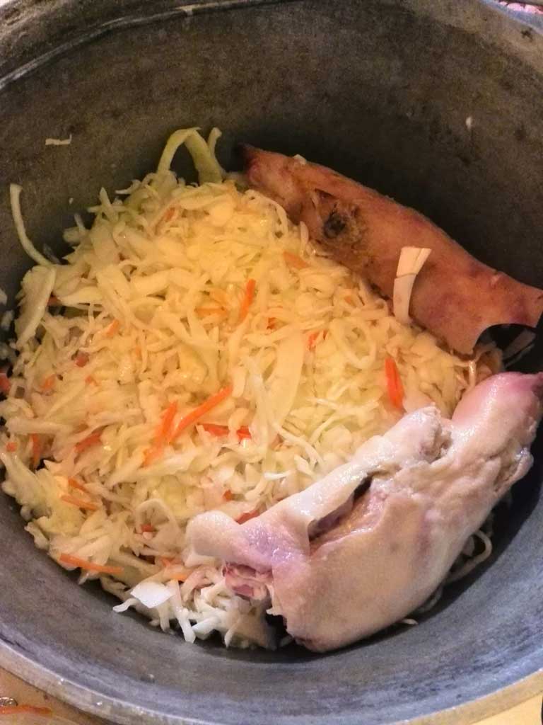 Следующий слой, все тоже самое свежая капуста, квашеная капуста но сверху выкладываем слоем наши обжаренные копчености