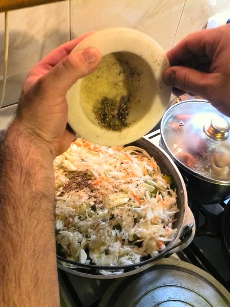 Перчим, закрываем крышкой, ставим почти на самый маленький огонь и забываем на 3 часа…
