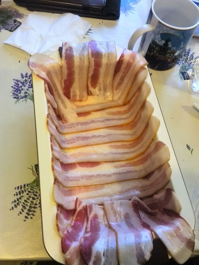 В форму для запекания выкладываем бекон, одним слоем немного внахлест.