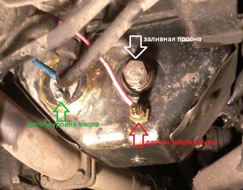Так это всё выглядит на поддоне АКПП. Соответственно вид спереди... Обошлось все в 3-4 рубля вместе с работой токаря. Собственно я ему отдал поддон с обоими датчиками, указал точки и забрал готовое. На поддон кинут (-), поскольку не был уверен, что он там есть... Пока всё работает, ничего не глючит... Думаю стоит кинуть ещё два датчика температуры на передний и задний редукторы (но уже без датчика уровня конечно) и соединить это всё с одним показометром с помощью тумблера на три положения.. тогда за всю трансмиссию можно быть спокойным - если где то что то начинает накрываться, например подшипник какой-нибудь, температура масла однозначно поползёт вверх и не надо голову ломать ступица это, опорный кардана, редуктор или сама коробка.
