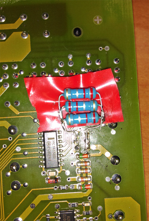 Достал блок, вскрыл - все чисто и сухо. Прозвонили резисторы и транзисторы - оказалось проблема в одном транзисторе и 3-х резисторах, которые с ним в связке. Найти точно такие же транзисторы и резисторы в Красноярске оказалось нереально (в оригинале FZ24NS и 6 резисторов на 0,22 Ом). В итоге, только в одном магазине радиодеталей (на якорном переулке) нашел более или менее подходящие резисторы и транзисторы. Купил 2 транзистора irfz34n (44р штучка) и 6 резисторов 0.5w 0R22 (3р штучка). Резисторы выпаиваются без проблем, а вот транзистор паяльником не очень удобно - у него средняя ножка припаяна под ним самим. В итоге строительным феном при температуре 400 градусов, погрел транзистор секунд 15 (предварительно отделив металлической планкой транзистор и поток горячего воздуха от соседних деталей) и он с легкостью отошел от платы. Были припаяны транзистор и резисторы как на фото и дополнительно залил герметиком разъемы подключения к блоку.