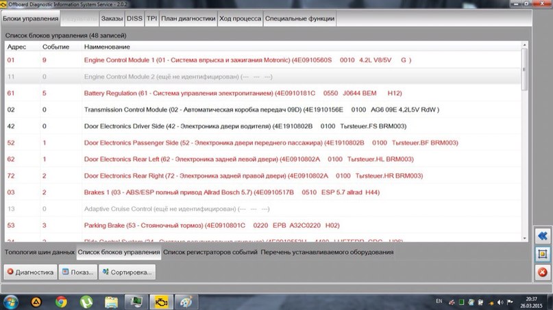 Приветствую уважаемые! После очень большого ремонта (акпп,раздатки,снятие двс,и замены сд-ченджера) odis выдает такую информацию,подскажите с чего стоит начать?!Автомобиль(A8l 2005 года мотор 4,2 bfm,quattro,keyless,) не работает очень много всего:горит давление масла(механически проверенно манометром все в норме),постоянно при включении зажигании работают оба вентилятора,пневмоподвеска не накачивается вообще(принудительно работает), мми выезжает пытается загрузить и через пять секунд обратно заезжает,кнопки подсветки мми не светяться. Кабель vas5054a только вчера подключили,особо в программе пока не разобрался,но вот что показывает: