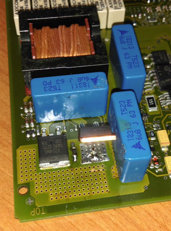 Достал блок, вскрыл - все чисто и сухо. Прозвонили резисторы и транзисторы - оказалось проблема в одном транзисторе и 3-х резисторах, которые с ним в связке. Найти точно такие же транзисторы и резисторы в Красноярске оказалось нереально (в оригинале FZ24NS и 6 резисторов на 0,22 Ом). В итоге, только в одном магазине радиодеталей (на якорном переулке) нашел более или менее подходящие резисторы и транзисторы. Купил 2 транзистора irfz34n (44р штучка) и 6 резисторов 0.5w 0R22 (3р штучка). Резисторы выпаиваются без проблем, а вот транзистор паяльником не очень удобно - у него средняя ножка припаяна под ним самим. В итоге строительным феном при температуре 400 градусов, погрел транзистор секунд 15 (предварительно отделив металлической планкой транзистор и поток горячего воздуха от соседних деталей) и он с легкостью отошел от платы. Были припаяны транзистор и резисторы как на фото и дополнительно залил герметиком разъемы подключения к блоку.