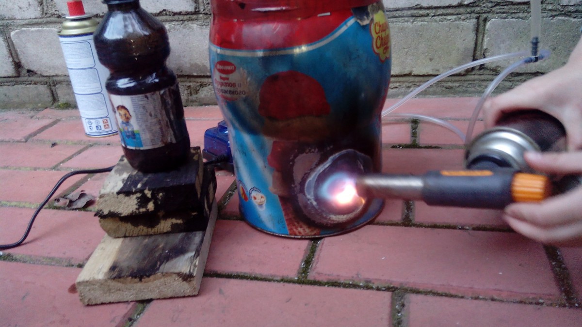 Заполняем банку щепой, закрываем крышку, включаем компрессор на максимум и поджигаем. Пока фоткал, эту процедуру поручил старшему сыну)