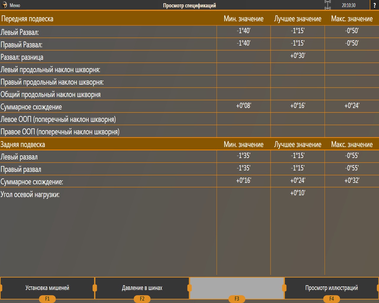 1) для стандартной подвески 2) для спорт подвески P.S: не забудь сказать чтобы давление в шинах выставили правильное. Да и калибровку перед регулировкой не мешало бы сделать.