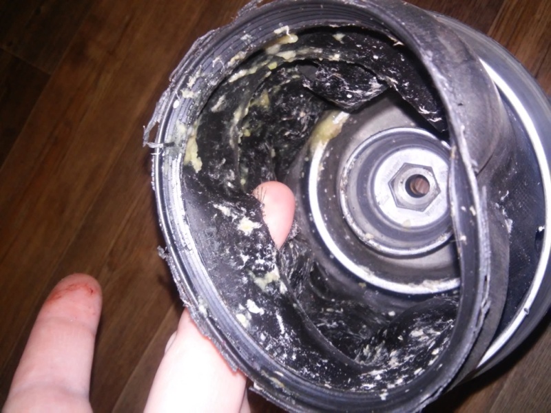 По всей стойке разбрызгана какая-то субстанция похожая на солидол с какими-то примесями (далее на фото увидите примеси похожие на бумагу 1grandmersy8 ). Так и не понял что это. Думаю или из амортизатора или его пытались восстановить. Но на сто не знают. Говорят еще до них лежал