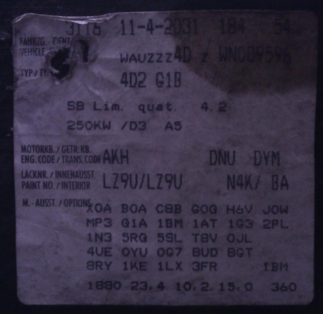 Вообще VINы пробиваются вот в этой теме:VETRA писал(а):3) Ну и сюда же всуну свой стикер из багажника. Подскажите, как его расшифровать? В смысле, комплектацию. Спасибо!