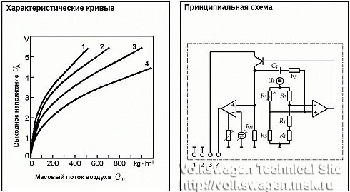 В потоке поступающего воздуха находится электрически нагреваемое тело (чувствительный элемент), которое охлаждается воздушным потоком. Схема регулирования нагревательного тока поддерживает постоянную разность температуры, и ток нагрева пропорционален массе воздушного потока. При данном методе измерения производится учет плотности воздуха, так как она также определяет величину теплоотдачи от тела к воздуху. Нагревательным элементом является пленочный платиновый резистор, который находится вместе с другими элементами на керамической пластине. Измерительный резистор (сопротивление которого пропорционально расходу воздуха) находится в непосредственном тепловом контакте как с нагревателем, так и с поступающим воздушным потоком и включен в измерительный мост. Благодаря разделению измерителя и нагревателя обеспечивается большая точность измерения. Напряжение на нагреваемом измерительном резисторе является мерой для массы воздушного потока. Далее это напряжение преобразуется (усиливается) электронной схемой, чтобы контроллер мог измерить его величину, т.е. происходит согласование уровней.