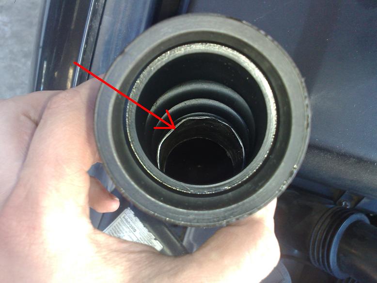 Теперрь раздел для тех, кто не хочет выкладывать 5-6 тысяч за новы патрубок, причем еще и ждать его... Каждый себе хозяин. Я купил новый, но он у меня протерся, потом расскажу как, но заново ждать неделю и снова 5.5к за него обломало, новый ведь хад. Напомню,в моем случае порвалось одно из колез гофры. Что я сделал: я вызелал аккуратно это кольцо, оставив его краешки, нарезал кусок металлической трубы котора имеет диаметр внутренностей моего патрубка, затолкал его в одну часть которая осталась после вырезания рваного кольца, а вторую часть одел на тот кусок трубы что осталась торчать. Короче трубка укрепила изнутри патрубок, тереь 2 хомута притянут обрезанные края к этой трубе, плотно подогнав эти части патрубка. На негофрированном патрубке это еще проще, он ровный, гофра чуть сложнее, главное точно нарезать, чтобы хомутам было за что зацепиться.