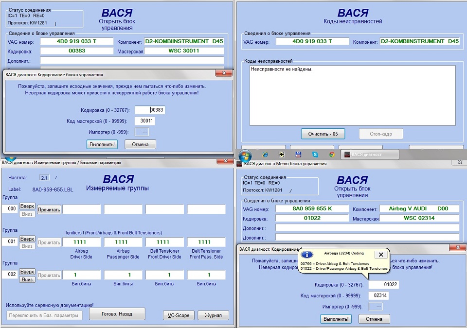 И вот казалось бы все просто, нет никаких подводных камней, как при смене "дорест. на рест." Но при установке и включении "новой приборки" загорелась и НЕ потухла лампа AIRBAG. VAG Com ругнулся "01025 неисправно управление аварийной лампой". Сравнив по эльзе схемы 96 и 97 годов, видно что в 96 году от блока подушек на приборку провод идет на 6 контакт зеленого штекера а в 97-98 году уже на 25-й контакт. Поменять пин в этих штекерах - дело примитивно простое... Но теперь работа аварийной лампы инвертировалась. При включении зажигания на приборке проходит тест всех схем, при этом лампа Airbag не горит, а когда уже гаснут все остальные лампы - Airbag наоборот загорается. VAG Com при этом уже не видит никаких ошибок, если не ставить лампу - тогда опять пишет "неисправно управление аварийной лампой"