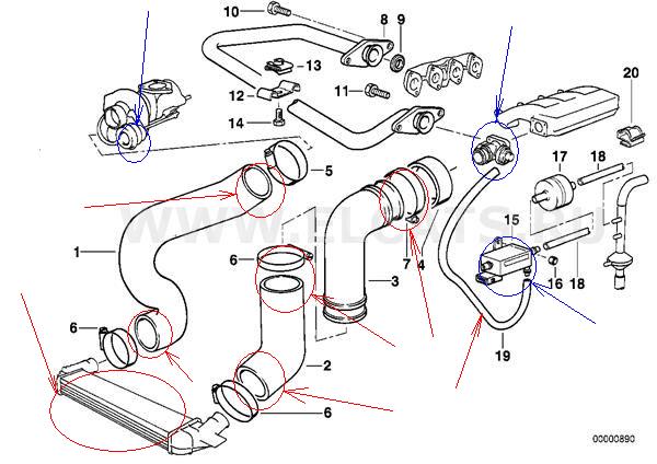 3. Перепускной клапан отработанных газов, аналог (blow-off), производит сброс давления из впускной системы (предотварщает образование ваккума), управляется магнитным клапаном, который в свою очередь чего-то там измеряет... Из-за попадающий грязи и нагара этот самый клапан може отрыться уже и при 2 оборотах. Проверить можно путем снятия шланга с детальки под №15. Если ситуация не поменялась значит скорее всего виноват он.