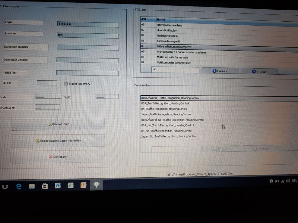 3: Далее берем VCP, пункт залить параметрию, далее загружаем ZDC файл a6_c7_imageProcessor_Camera_4g0907107e, у меня блок изображения 4g0907107e, поэтому я и взял файл a6_c7_imageProcessor_Camera_4g0907107e, ВЫ загружаете ZDC под свой блок!. После загрузки файла выбираем блок 8E, ставим галочку на RestOfWorld_TrafficRecognition_HeadingControl, ставим галочку напротив EraseFulMemory и заливаем, процедура длится несколько секунд.