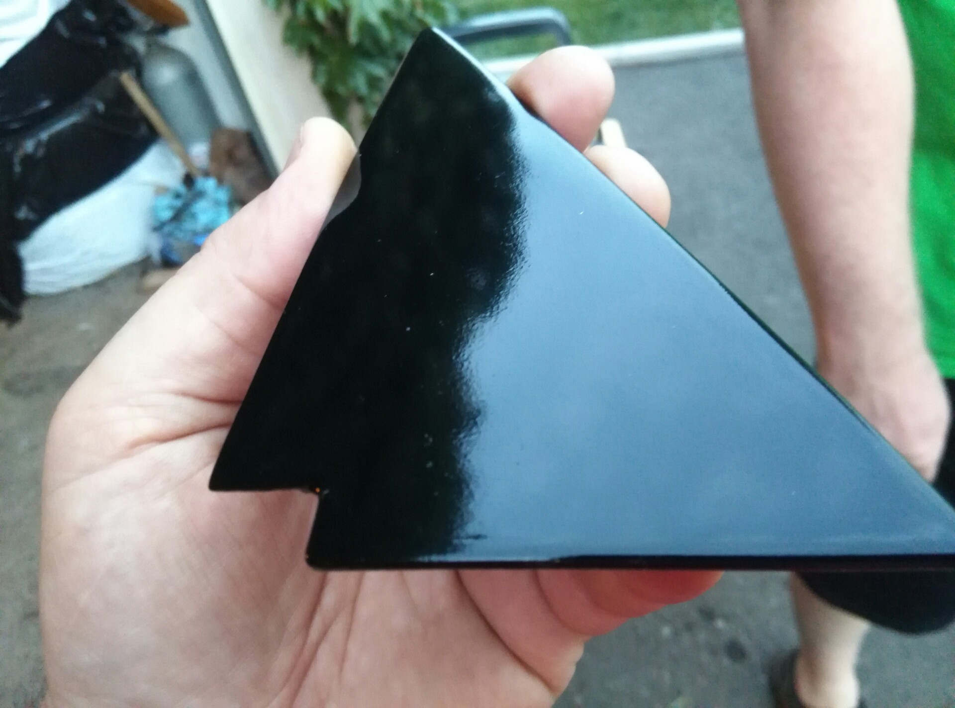 Мелкие детали нормально лаком покрываются,без всякой шагрени.Я даже диски красил и лачил с баллончика.Только эти балонные краски и лаки боятся бензина-задний правый диск лак поплыл от заправки через воронку.И практически не возможно отполировать(очень мягкий и тонкий слой)И этот треугольник лучше сделать матовым,в тон резинки.Для этого продаётся специальная матовая краска в баллончиках.