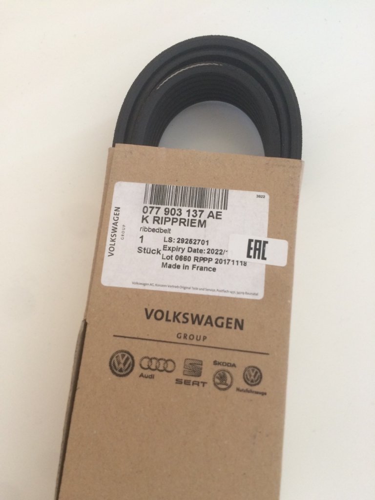 Следующая поломка, также нежданно негаданно произошла, при чем странно. Еду, никого не трогаю, тут машина глохнет. Завожу, газую, все нормально, только торогаюсь, опять глохнет. При чем глохнет не сразу, а еще пытается работать. Завожу, смотрю пропал ГУР, горит лампочка генератора. Думаю что все понятно, ремень приводной оборвало и машине не хватает напряжения работать. Кое-как, постоянно заводя авто доехал до гаража, благо он не далеко. Без ГУР и глохнущей машиной то еще приключение заехать в гараж задом (чтобы удобнее было эвакуатором забирать). Поднял капот, и да, действительно, причина была найдена, по центру ремень разошелся: Пришлось заказывать ремень, эвакуатор и опять машину в сервис. Там уже ждали как родных, поставили новый ремень 077 903 137 АЕ (У меня уже стоял модернизированный): И что самое забавное, только выезжать из ауди центра, и она глохнет сразу же за воротами. В сервисе сказали, что думали что стоит секретка, мы и не напрягались. Обратно закатили, подключили манометр и конрольку на питание насоса, и сразу же стало видно, давление падает, но питание на насос есть. Приплыл вот так вот правый насос, а ремень скорее всего уже следствие, а не причина. Чтож, пришлось оставлять машину в сервисной зоне, заказывать насос, ждать 10 дней. Заменили насос и вот уже неделю все в норме, да и машина поехала пободрее. Посмотрел состоянии заборной сетки, на ней есть серый налет, но засрана была не смертельно.
