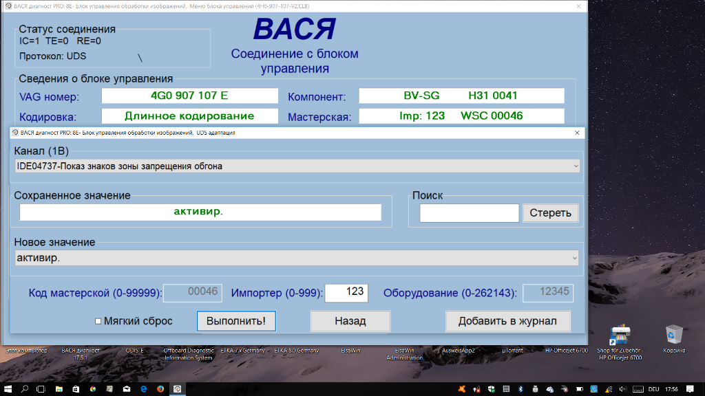 3: Далее берем VCP, пункт залить параметрию, далее загружаем ZDC файл a6_c7_imageProcessor_Camera_4g0907107e, у меня блок изображения 4g0907107e, поэтому я и взял файл a6_c7_imageProcessor_Camera_4g0907107e, ВЫ загружаете ZDC под свой блок!. После загрузки файла выбираем блок 8E, ставим галочку на RestOfWorld_TrafficRecognition_HeadingControl, ставим галочку напротив EraseFulMemory и заливаем, процедура длится несколько секунд. 4: После всего этого у кого все получилось, берем ВАСЮ итп, заходим в блок изображения 8E, заходим в закрытую область и в водим логин S12345, далее в каналы адаптации и проверяем канал IDE04733-Распознание дорожных знаков, чтоб было в режими Fusion, если нет то выбираем режим Fusion, это нужно для того чтобы система работала вместе с навигацией 5: проверяем канал IDE04734-Постоянный показ максимальной скорости, чтобы было всегда. 6: канал IDE04736-Показ знаков окончания зоны действия огр. максимальной скорости, значение 1. 7: канал IDE04737-Показ знаков зоны запрещения обгона, активируем. У меня знаки обгон запрещён так и не хочет отображать, но читал, что у кого то показывает, зависит от приборки и блока изображения. 8: канал IDE04815-Показ действующих дополнительных знаков, активируем. 9: канал IDE04816-Включение приоритета доп.знаков:действующих при влажн. покрытие, активируем. После всех перечисленных действий должно все работать. Если все таки не работает то в зеленом меню проверяем строчку car/carbusassignment/Traffic sign recognition(VZE) чтоб значение было как на фото ниже, но по умолчанию должно стоять правильное значение. Но и фотки, что система работает