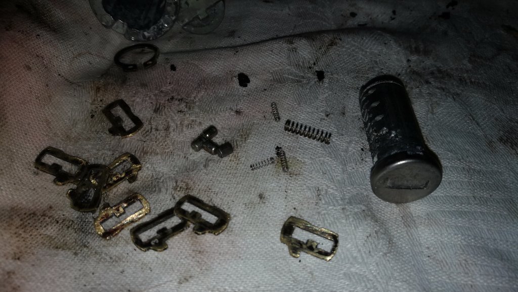 Теперь сама личинка((Стопор снят,берём бубен(ключ и wd) и начинаем заливать ,и мучать ее ключом!можно отмочить,продувать-тут кто на что горазд будет!;)Цель-что бы ключь вошёл до конца!иначе защёлки не дадут выйти лечинки из корпуса!когда ключ загнан,начинаем с одной стороны давить ,а с другой гонять ключ туда-сюда!Тут дело не в скорости,а в плавности!!!засовы убираются заподлицо только в определенном моменте.И в этот момент личинка выскакивает из корпуса до следующего засова!так вылавливает их все и...