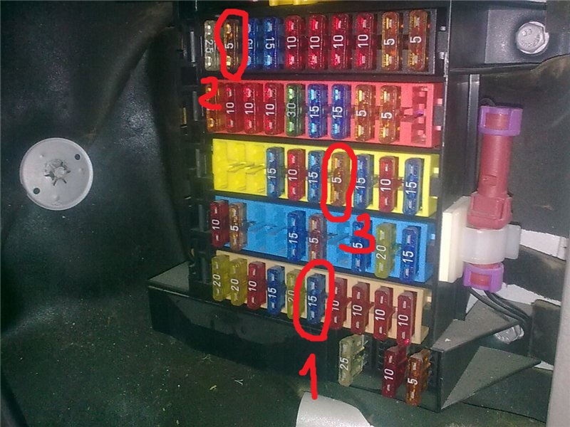 Всем привет,заколебался заряжать акум,купил новый,с ним теперь та же история,решил проверить утечку тока,выключил все приборы,вынул ключ,снял минусовую клемму и мультиметром начал измерять,показало 560ма,подождал минут двадцать,показало 360ма,начал вытаскивать предохранители,сначала вытащил номер один,утечка упала до 110ма,потом вытащил номер два упала до 60ма и при вытаскивании номер три упала до 40ма,сигналка не штатная,с автозапуском,магнитолы нет вообще,теперь,когда с нештатного брелка закрываешь машину,она ставится,но центральный замок не работает,не открывает,не закрывает,цз родной,вакуумный,также не работают стеклоподьемники,освещение в салоне,остальное вроде так же,приборы горят,машина заводится,подскажите что за предохранители и куда копать,сейчас без этих трех предохранителей