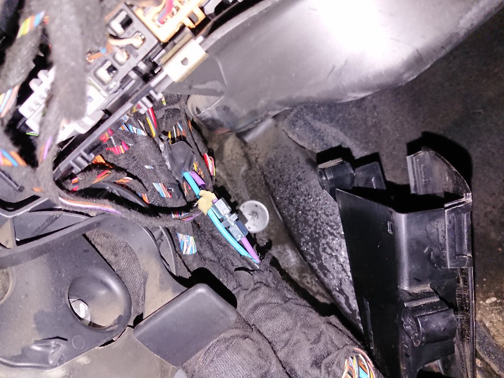 Сняли обшивку низа дверного проема. Оттянули коврики. Добраться до петли мешала коробка со жгутами проводов.