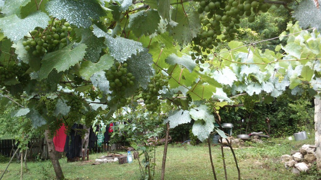 И это не только известные всем хачапури по Аджарски, но и борано, малахто, синори, чирбули. Хозяин - Ладо, еще и искусный винодел. После дегустации, можно выбрать к столу понравившееся вино из винограда, растущего тут же. А это малоизвестные в России Аладастури, Отсханури сапере, Цоликаури и жемчужина Аджарии - розовое Чхавери. Впечатлил двор накрытый лозой с огромными кистями десертного сорта Хариствала (в переводе - бычий глаз). Ну а если засидимся у Ладо, то можно у него и переночевать, чтобы на завтрак получить ту самую настоящую аджарскую "лодочку".