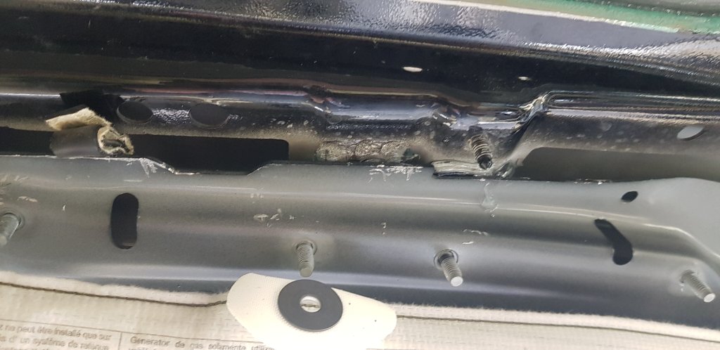 Насадил примерно, держится на аирбэгах. Одну сторону запихиваем до упора пока не упрется в болты. Теперь мы видим сколько нам надо запихать вставку во внуторь. Черные пятна на вставке это места клея, клеить будем посже. Для того что бы впихать, пришлось отогнуть задний угол.