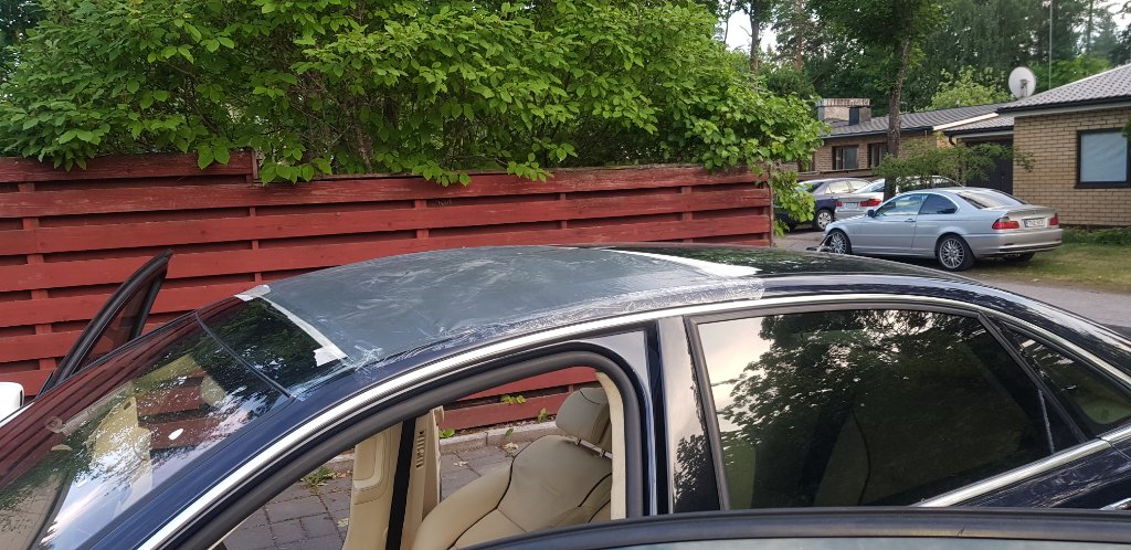 Края загнуты пока что только вниз, так как заднюю часть загиба не надо клеить, она просто загибается. Ставим люк и проверяем как у нас получилось. Будьте осторожни с установкой, не порвите прокладку, я порвал, новая стоит 220евро. Люк весит много, одному очень сложно и тяжело его установить. Позвоните опять другу если будете примерять на следующий день. Запихивал его анологично вставке через переднюю пассажирскую дверь. Если вроводка не готова, люк можно крутить спомощью спец ключа. ЭТОГО ДЕЛАТЬ НЕЛЬЗЯ, так как у нас еще не загнуты края назад, а только вниз.