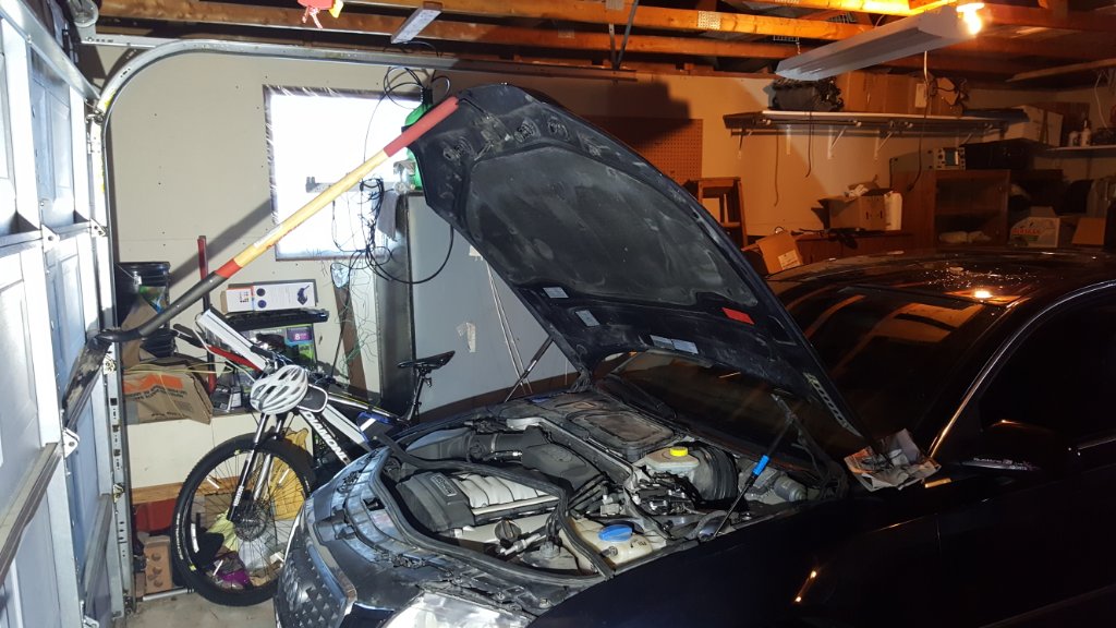 Я просто одну сторону капота открутил, чтобы съемником залезть, после этого пришлось его держать.