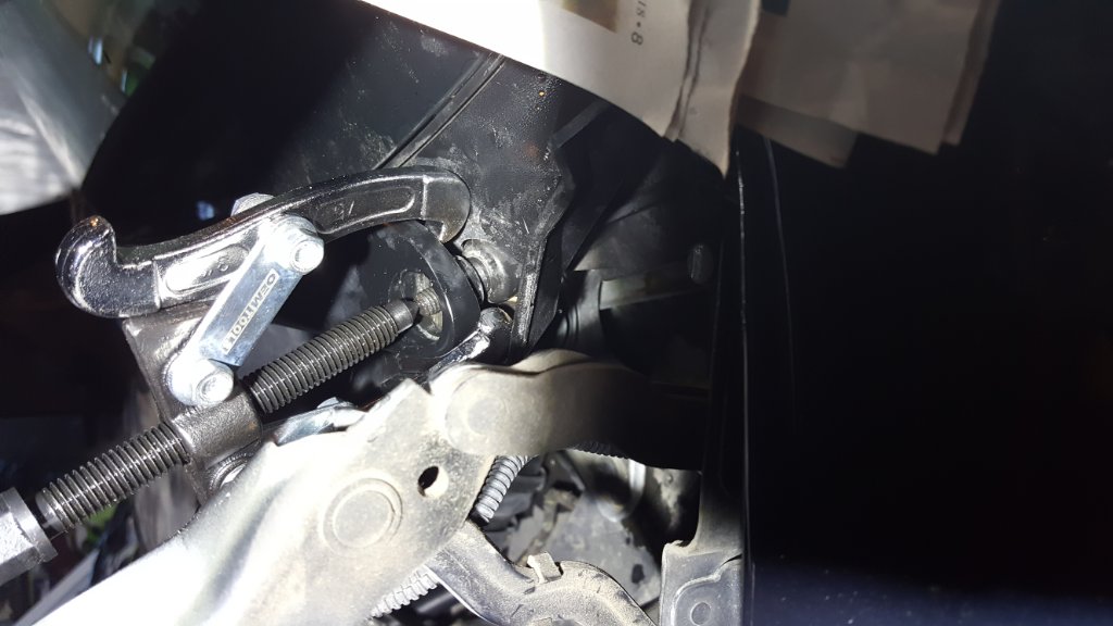 Я просто одну сторону капота открутил, чтобы съемником залезть, после этого пришлось его держать.
