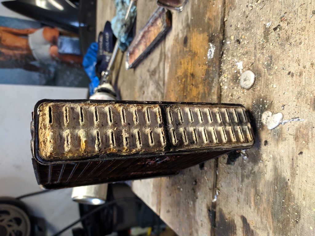 После запайки дырок по этому каналу и подаче пары атм воздуха дырочки обнаружилисьи в соседних каналах. Интересно. Не думаю что эта жижа разьела-к тому же первый радиатор час работал, а этот только пару минут. могу предположить только что в этом внутренняя корозия уже глобальная и любое такое воздествие доделывает работу. Или все таки жидкость по меди сильно агрессивная? Помню что лимонной кислотой по алюминию чистили. Может и ее безопаснее по меди?