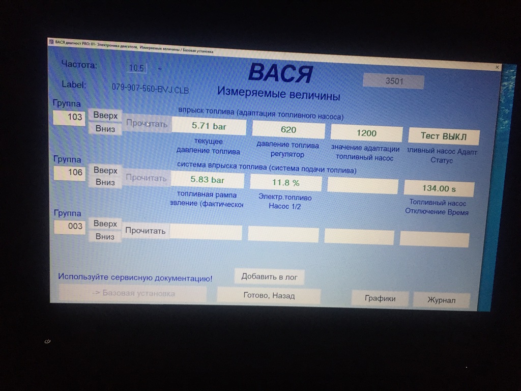 Прогрейте мотор. Затем заглушите и сразу же включите зажигание не запуская двигателя. Программа диагностики сразу же сбросит на ошибку, поэтому сразу же после включения зажигания снова прочитать блоки 103 и 106. Если в 106 блоке значение начнёт расти, то можно сделать вывод, что с форсунками всё в порядке. В противном случае - форсунки текут. В 103 блоке значение должно оставаться таким же как и на заведённом моторе.