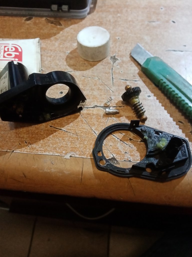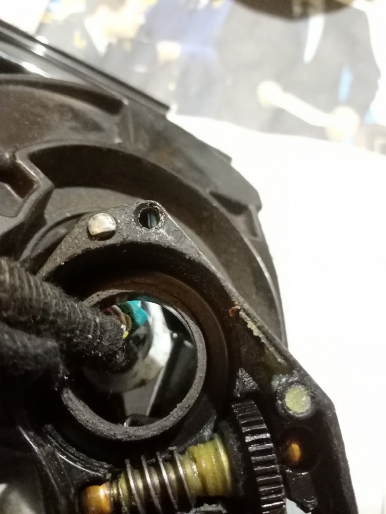 И видим четыри винтика откручиваем их и вынимаем моторчик. Снимаем снего фишку и теперь можим при желании проводку через редуктор чтоб не мешала. На фото вверху я уже снял пластиковую крышку и мы видим виновника из за чего оно (зеркало) неостанавливолось это белинький шплинтик (на фото внизу) он закис и не выходил. С противоположной стороны есть малинькая дырочка внее впихиваем что-то тонкое и выталкиваем етот шплинтик обратно дальше его вынимаем посатижами чистим от окислей смазиваем и ставим на место и собираем все в обратном порядке.
