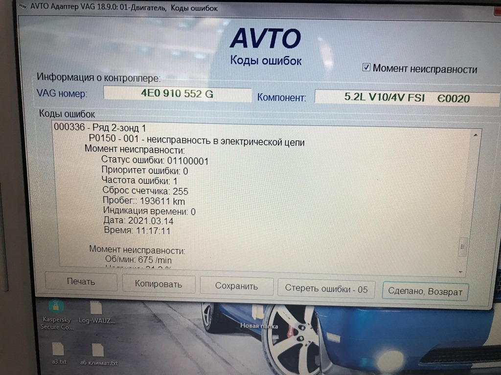 Слав, получается по первому блоку ошибка 06435 (не помню о чем гласит), якобы ругается на 2-ой блок, а во втором блоке - 12823 обрыв цепи, нет связи, непостоянно. Ряд 3, Зонд 2 (как то так, но дословно завтра скажу). Стер ошибку во втором блоке по лямбде и ушла ошибка в первом блоке! Завтра катнусь и снова прочту!