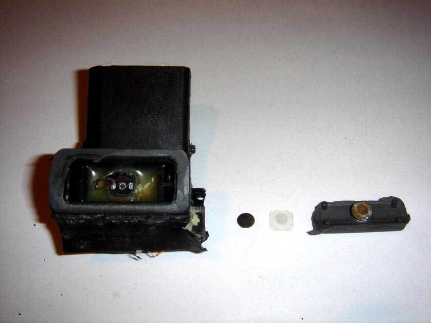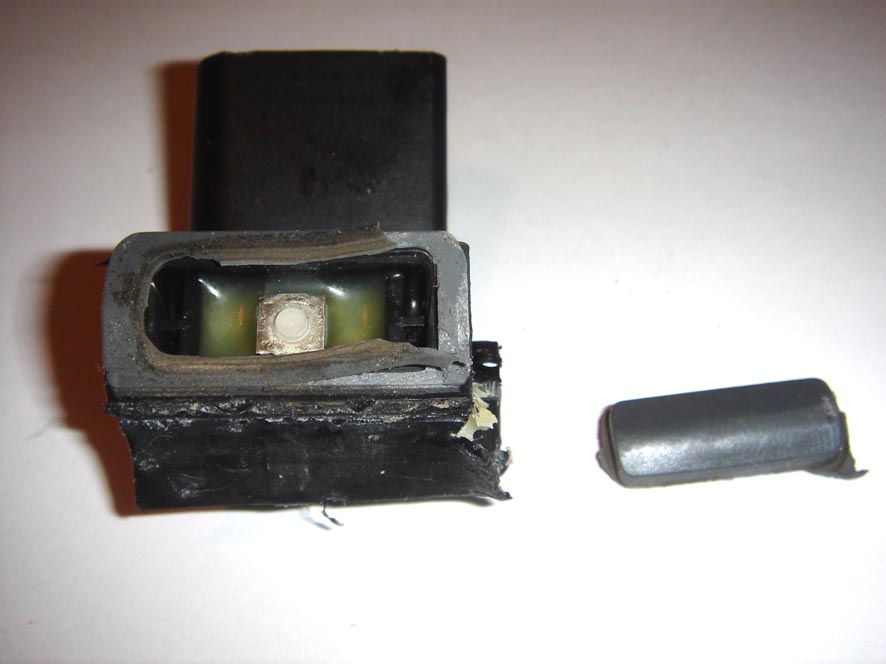 Фишка и кнопка - составные части одного модуля, в который также входит антенна системы распознавания ключа (длинный магнитный сердечник, обмотанный тонкой медной проволокой. Все это в заводских условиях вставляется в корпус ручки и намертво заливается резиновым герметиком. В результате практически невозможно извлечь этот модуль из ручки, не повредив антенну. Хромированная накладка прикручивается к модулю также до того, как тот вставляется в корпус ручки. Именно поэтому ее невозможно снять, не сломав, т.к. два из четырех болтиков, которыми она крепится, расположены головками внутрь, т.е. туда, где все залито герметиком.