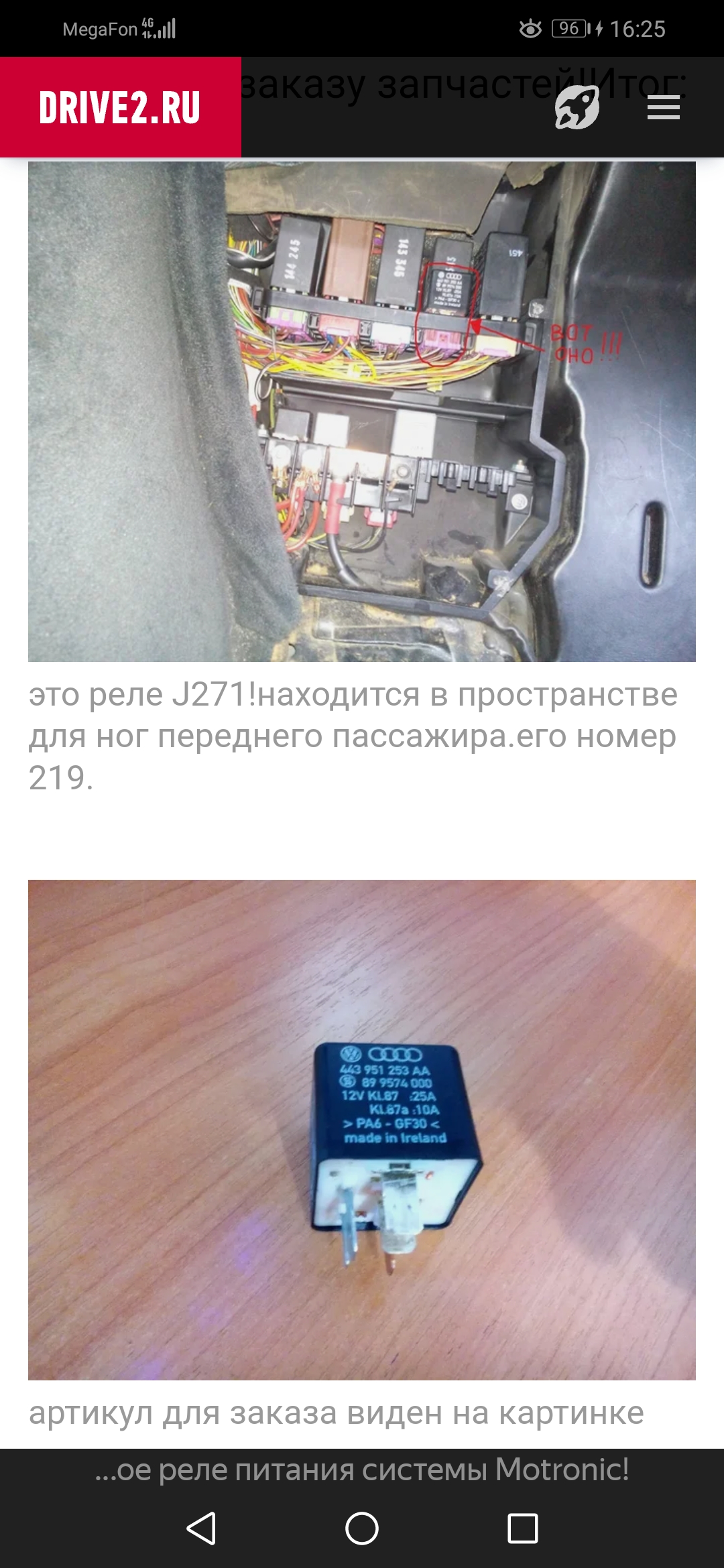 . Помогите найти реле J271. Ни в интернете ни поиском решение проблемы не нашёл. На drive2.ru человек пишет что оно под номером 219, но у себя я его не нашёл. Попадается схема второго блока реле и предохранителей в моторном отсеке, но и его я не вижу.