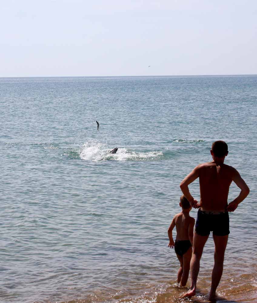 Удивительно, но каждый раз приплывают дельфины под самый берег. Люди выскакивают на песочек, а они резвятся: ловят кефаль играючи В этот раз дельфин носом вытолкнул из воды медузу (жаль, фотки нет)