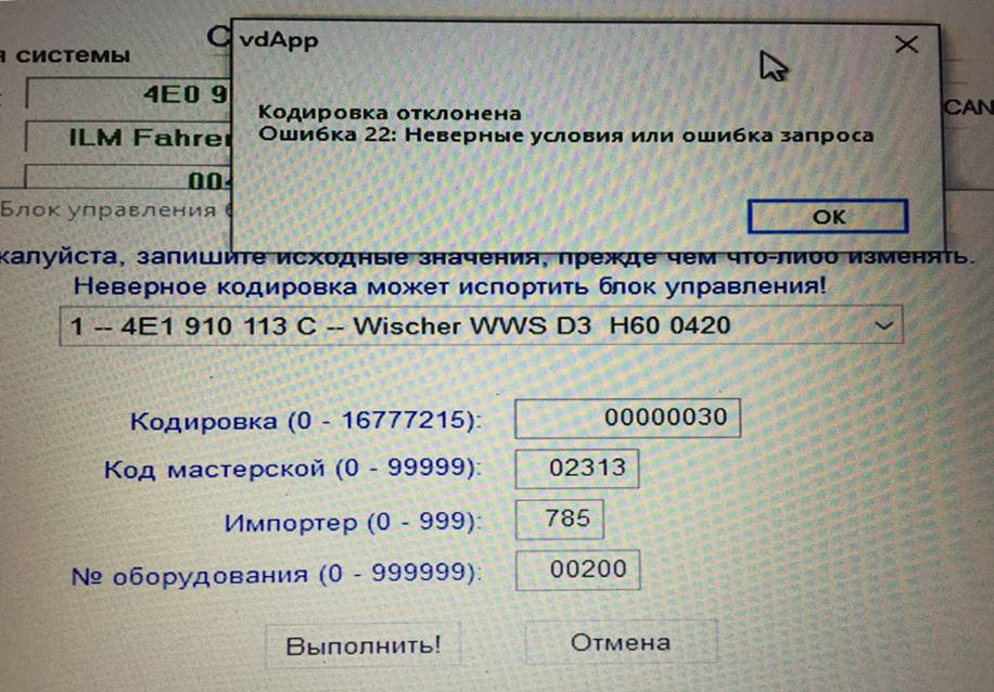 Привет! Недавно заменил блок управления дворниками под жабо, теперь не могу внести родную кодировку в новый блок. На старом блоке была кодировка 30, а на новом уже сразу стояла 35. При попытке поставить родную кодировку 30, кодировку не принимает. Проблема выражается - временами некорректная работа дворников. (Адаптация). Как заставить блок принять новую кодировку? Какие условия он требует?