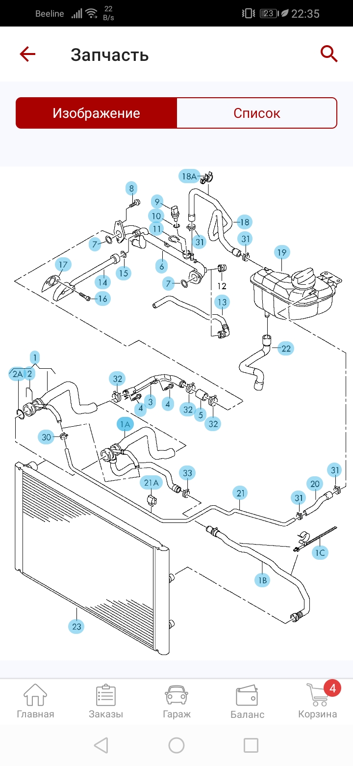 Я уже систему заполнил не знаю увижу номер или нет позже буду дома попытаюсь посмотреть, но на нём 4 выхода с правой 2 больших с лева один сверху маленький идет трубка как раз от флянца патрубка который и надо поменять, а с низу с лева чуть по больше.