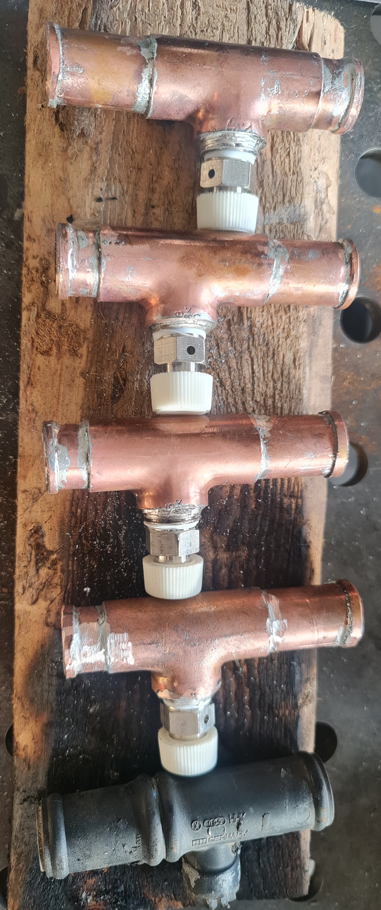 Добрый день самоделкины, потрескались и у меня эти тройники, но так как легких путей не ищем, а меди у меня после ремонта немного осталось то и решил проблему. Поручики, тряпками прошу сильно не бить, час работы и пол дня беготни по городу, ну нет таких кранов маевского в обычных магазинах. Поиск на фарпосте рулит. Медь 18мм, две вставки 40 мм и 26 соответственно, тройник обрезал, футорку наполовину обрезал, а грани обточил, зачистил все намазал флюсом и опаял оловом. Ершик на концах отпилил как раз от тройников и с прямой муфты на трубу. Минимально шлифанул. Покрасил. Затраты минимальны примерно 200р. штука. Всем спасибо.