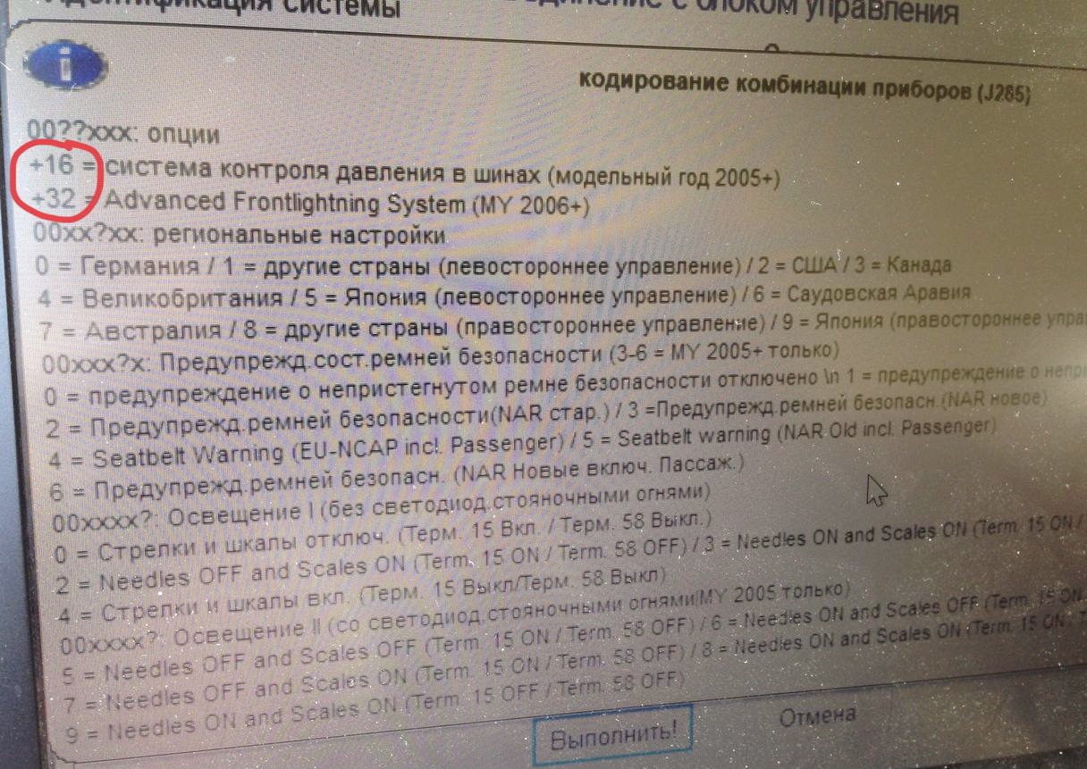 Доброго дня, друзья! Кто кодировал приборку, подскажите пожалуйста назначение первой ячейки кодировки...обвёл красным маркером на скриншоте. Хотелось бы узнать за что они отвечают. Например система контроля давления в шинах работает и при включённой и при выключенной кодировке. По поводу адванцед фронтлайт систем тоже непонятно...якобы идёт после 2006...(p.s. Фары сейчас стоят 2007 года, адаптив, и поворотные линзы и боковой свет)...может с этим как-то связано? Приборка не родная, на данный момент стоит кодировка 00.