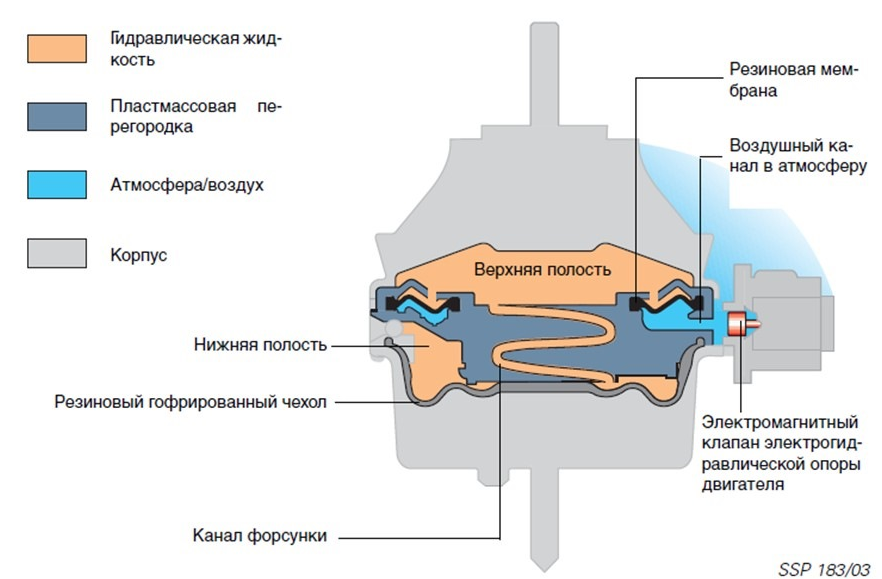 В режиме холостого хода, то есть при оборотах двигателя до 1100 об/мин, опора мягкая. За счёт небольших высокочастотных колебательных движений двигателя гидравлическая жидкость в верхней полости находится под давлением в соответствии с колебаниями двигателя. Небольших колебательных движений двигателя недостаточно для того, чтобы протолкнуть гидравлическое масло через канал форсунки. Поэтому давление действует на резиновую мембрану. Она деформируется и выталкивает воздух через открытый воздушный канал.